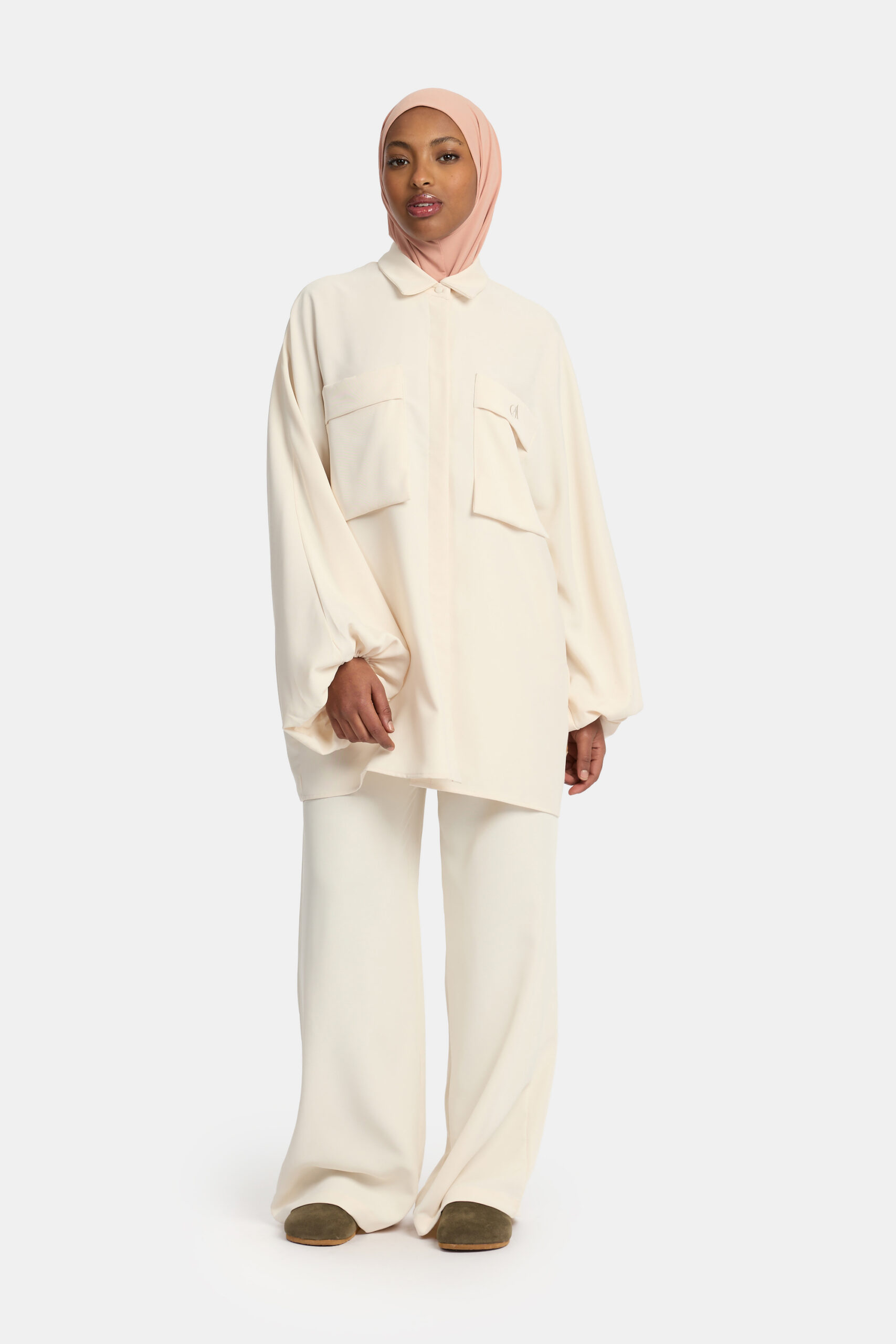 Deze stijlvolle twinset bestaat uit een luchtige blouse met wijde ballonmouwen en een losvallende pantalon met handige steekzakken. Gemaakt van comfortabele stretchstof (95% polyester, 5% spandex) voor een elegante en moeiteloze look.
