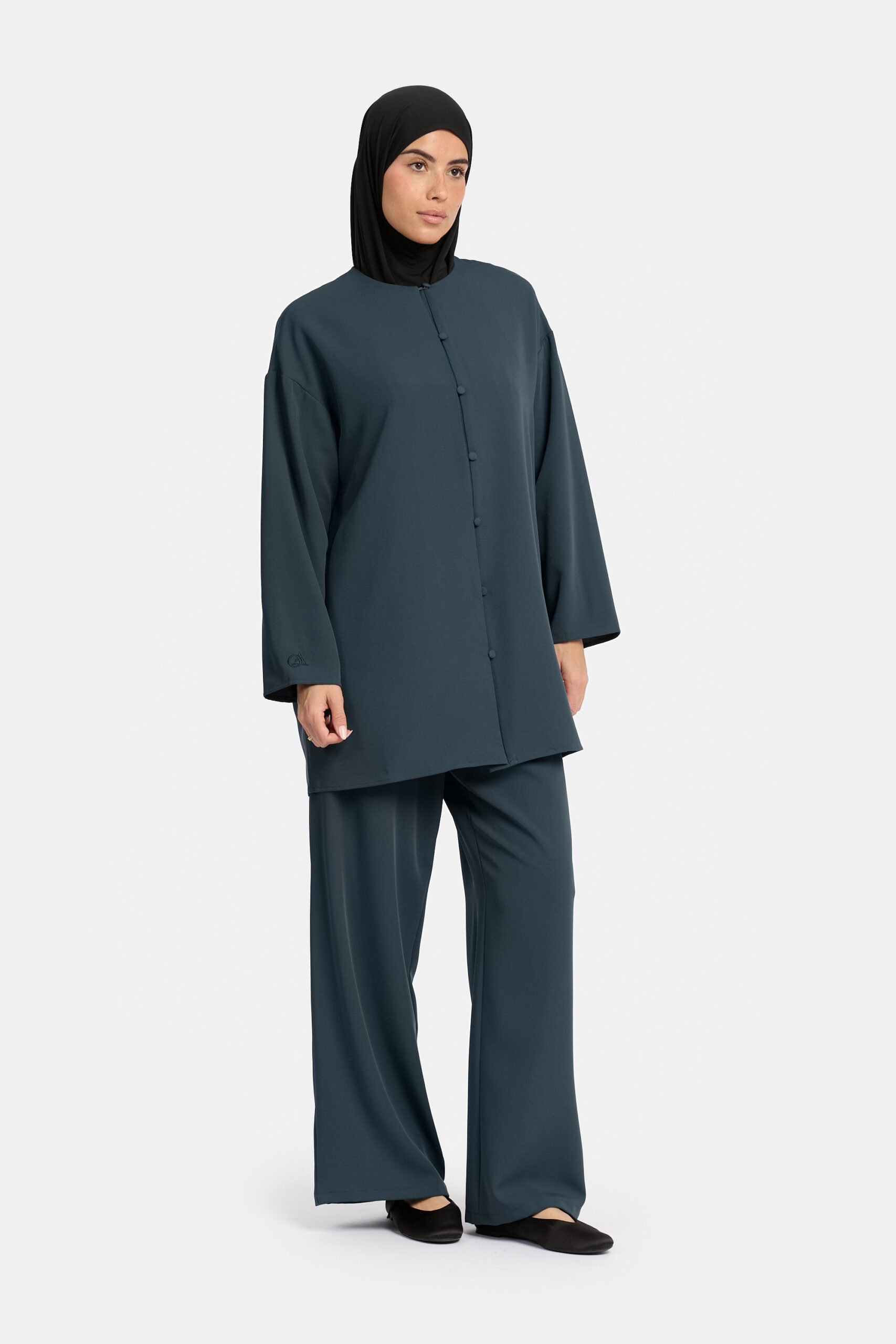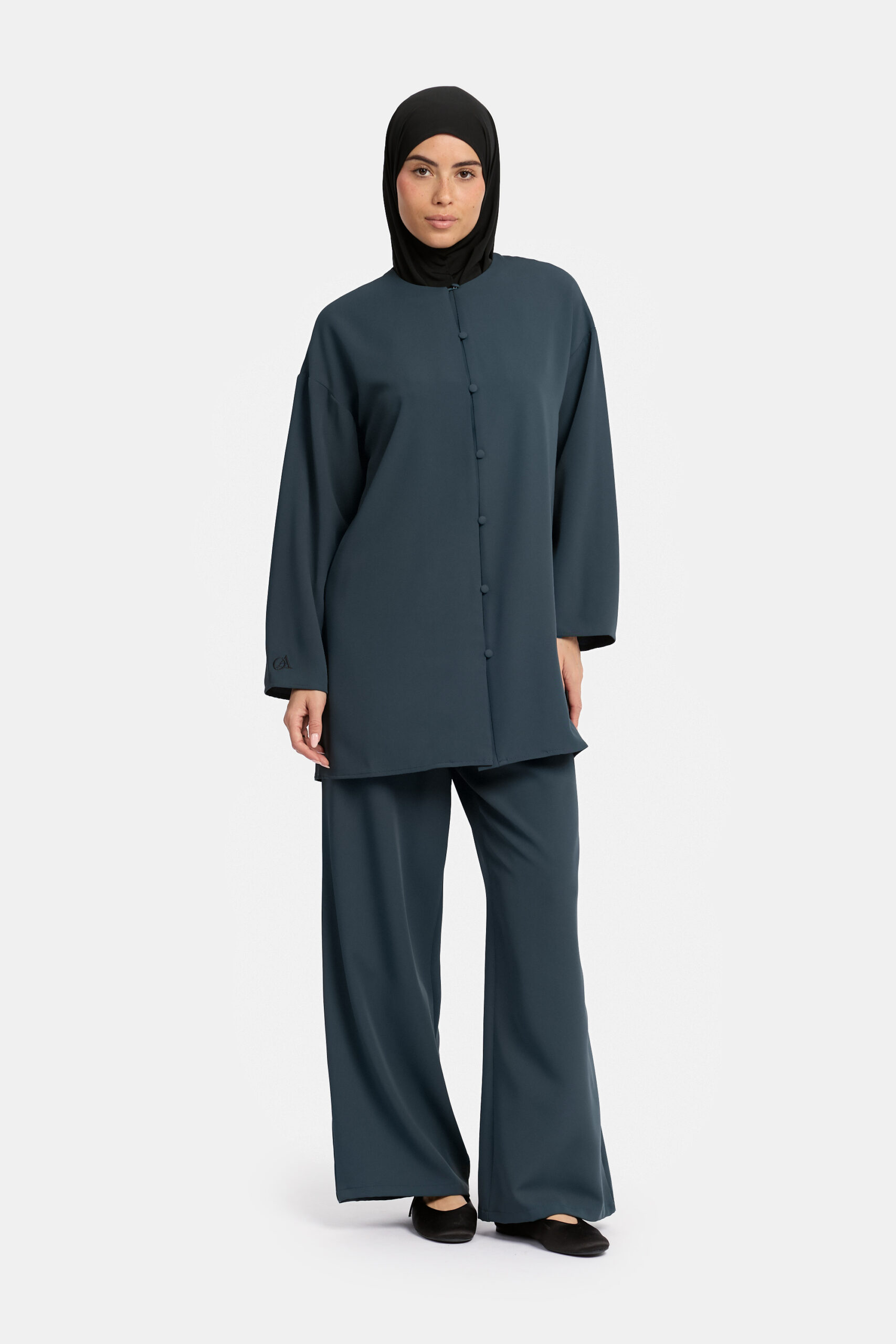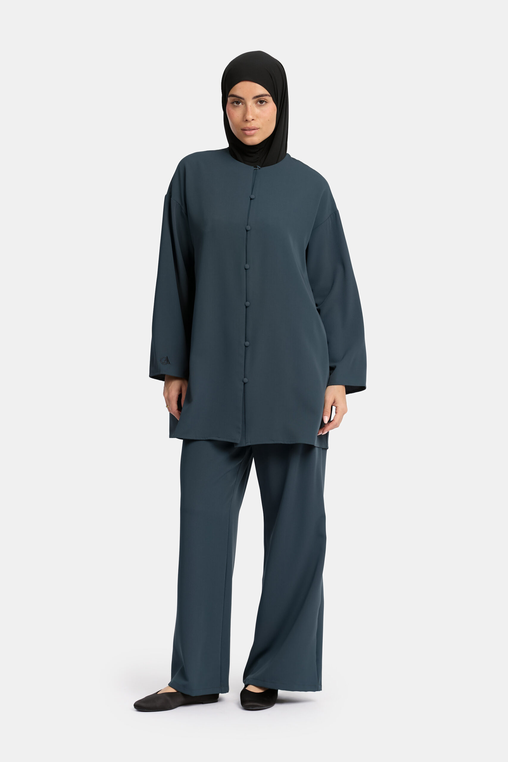 De set valt op maat en combineert comfort met een chique uitstraling, perfect voor zowel dagelijks gebruik als een geklede gelegenheid.Deze stijlvolle twinset bestaat uit een luchtige blouse met knopen en een losvallende pantalon.
