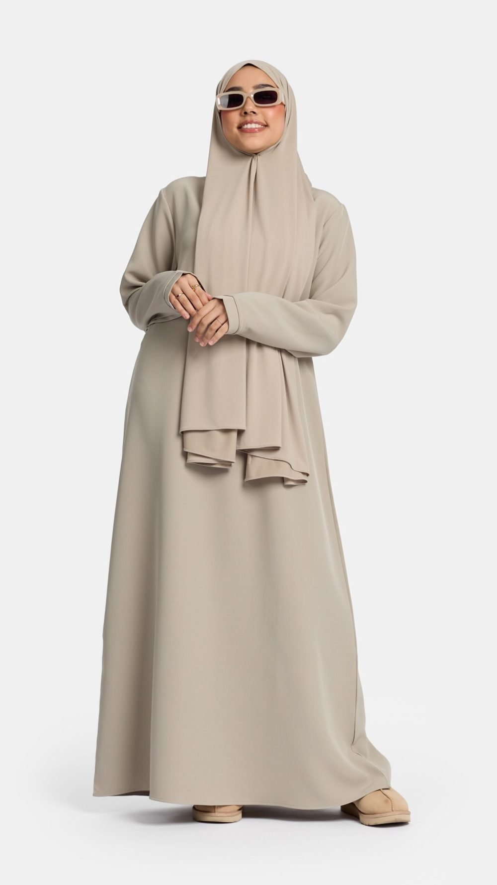 De Classic abaya heeft een ronde hals en een blinde rits aan de achterkant, wat zorgt voor een strakke en verfijnde afwerking.