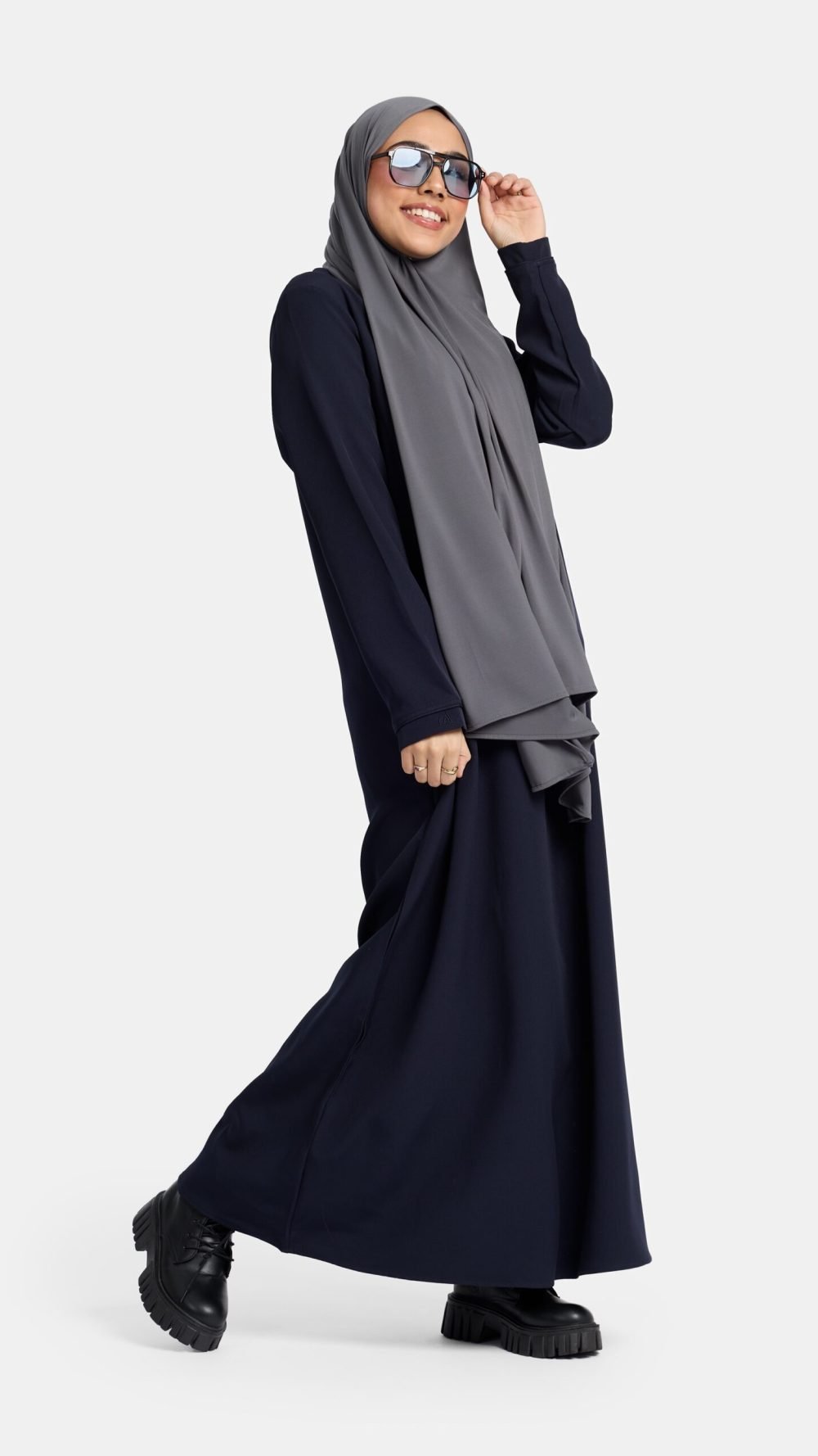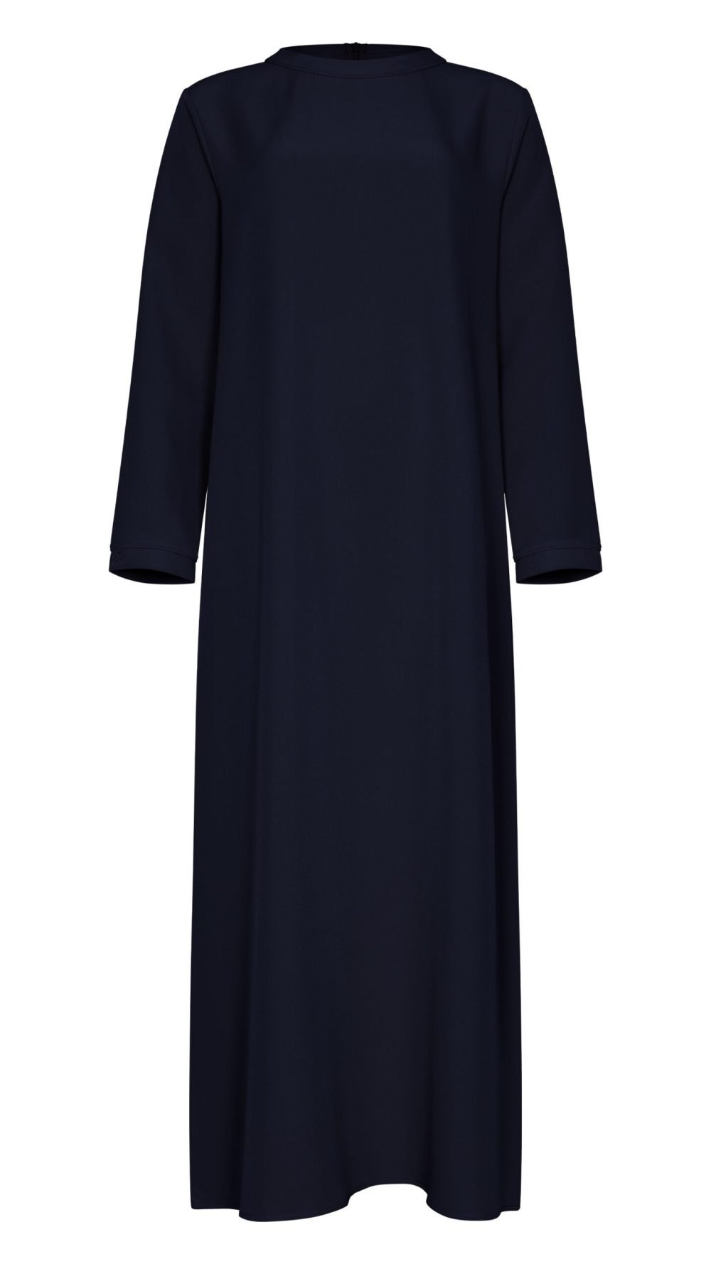 De Classic abaya heeft een ronde hals en een blinde rits aan de achterkant, wat zorgt voor een strakke en verfijnde afwerking.