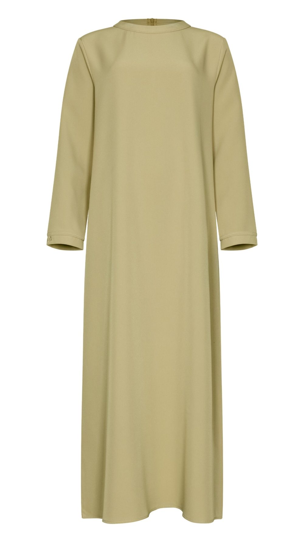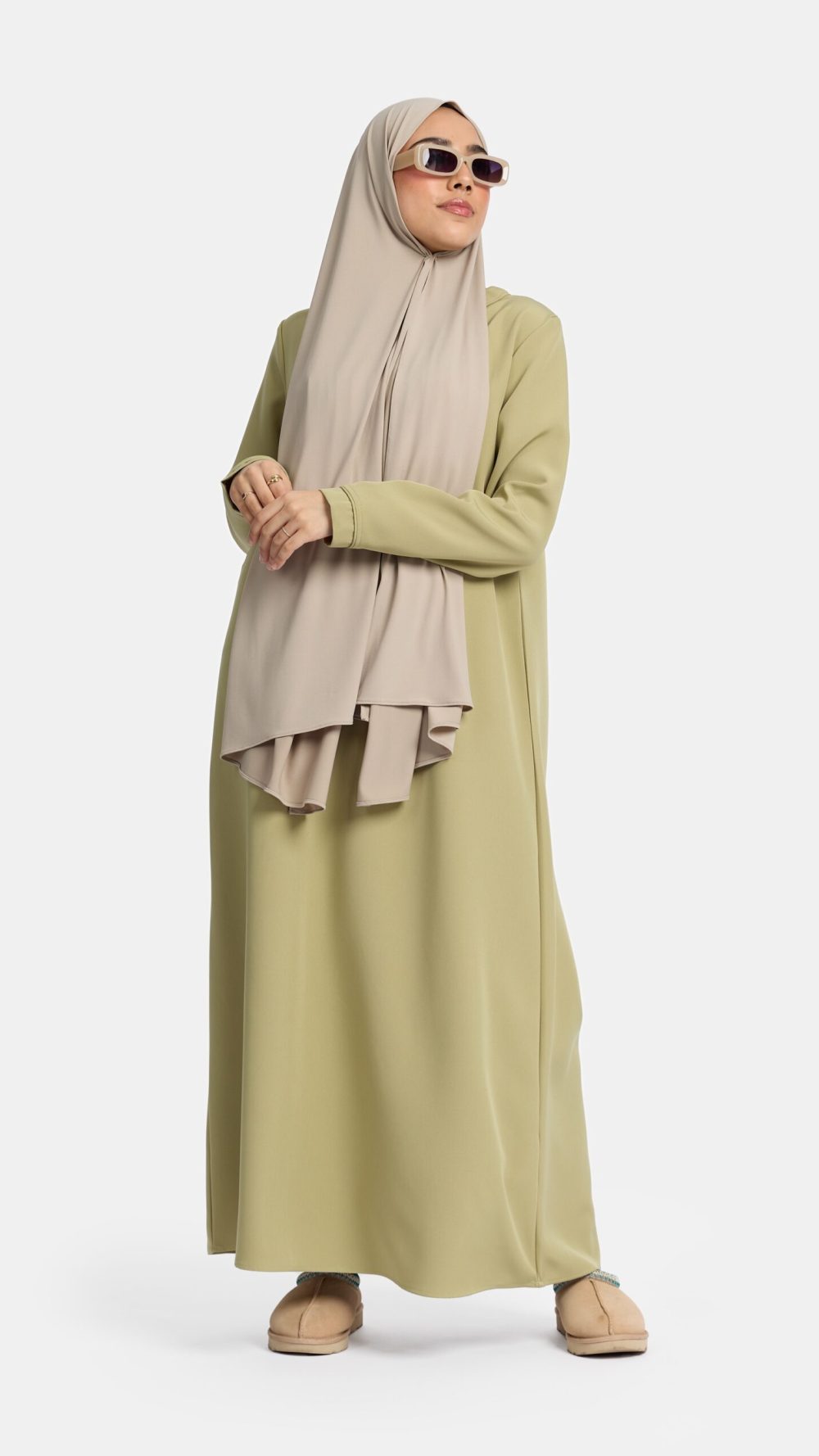 De Classic abaya heeft een ronde hals en een blinde rits aan de achterkant, wat zorgt voor een strakke en verfijnde afwerking.