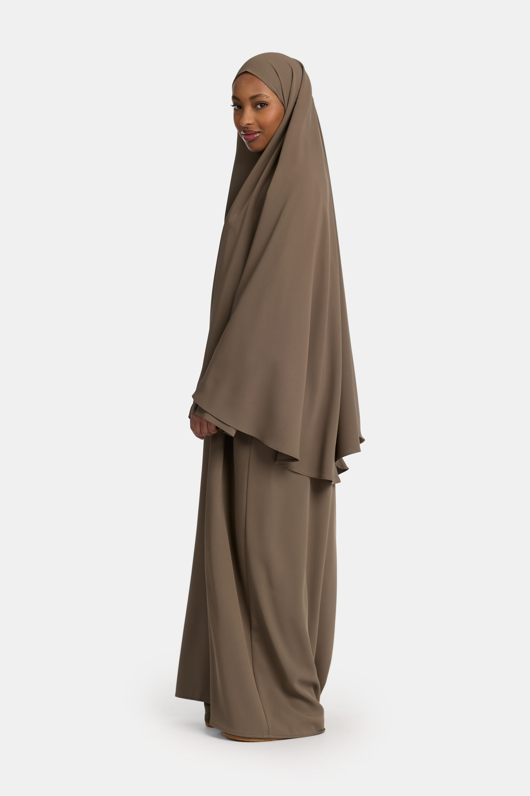 De Khimar combineert moeiteloos comfort, functionaliteit en stijl. Gemaakt van een mediumweight stof (95% polyester, 5% spandex), biedt deze khimar precies de juiste dikte voor koelere dagen zonder zwaar aan te voelen.