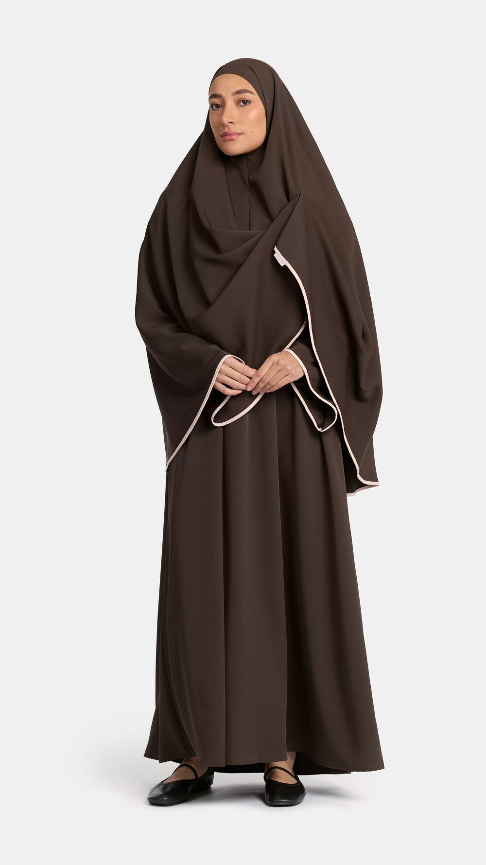 De bijbehorende khimar deelt dezelfde verfijnde kenmerken, waardoor het setje perfect te combineren is voor een complete look.