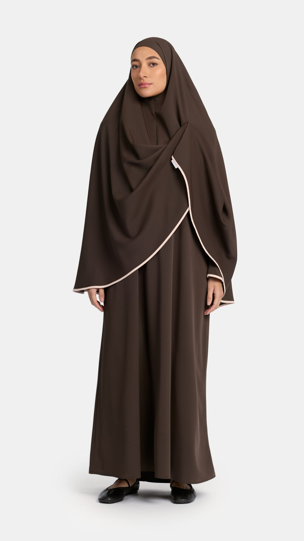 De bijbehorende khimar deelt dezelfde verfijnde kenmerken, waardoor het setje perfect te combineren is voor een complete look.