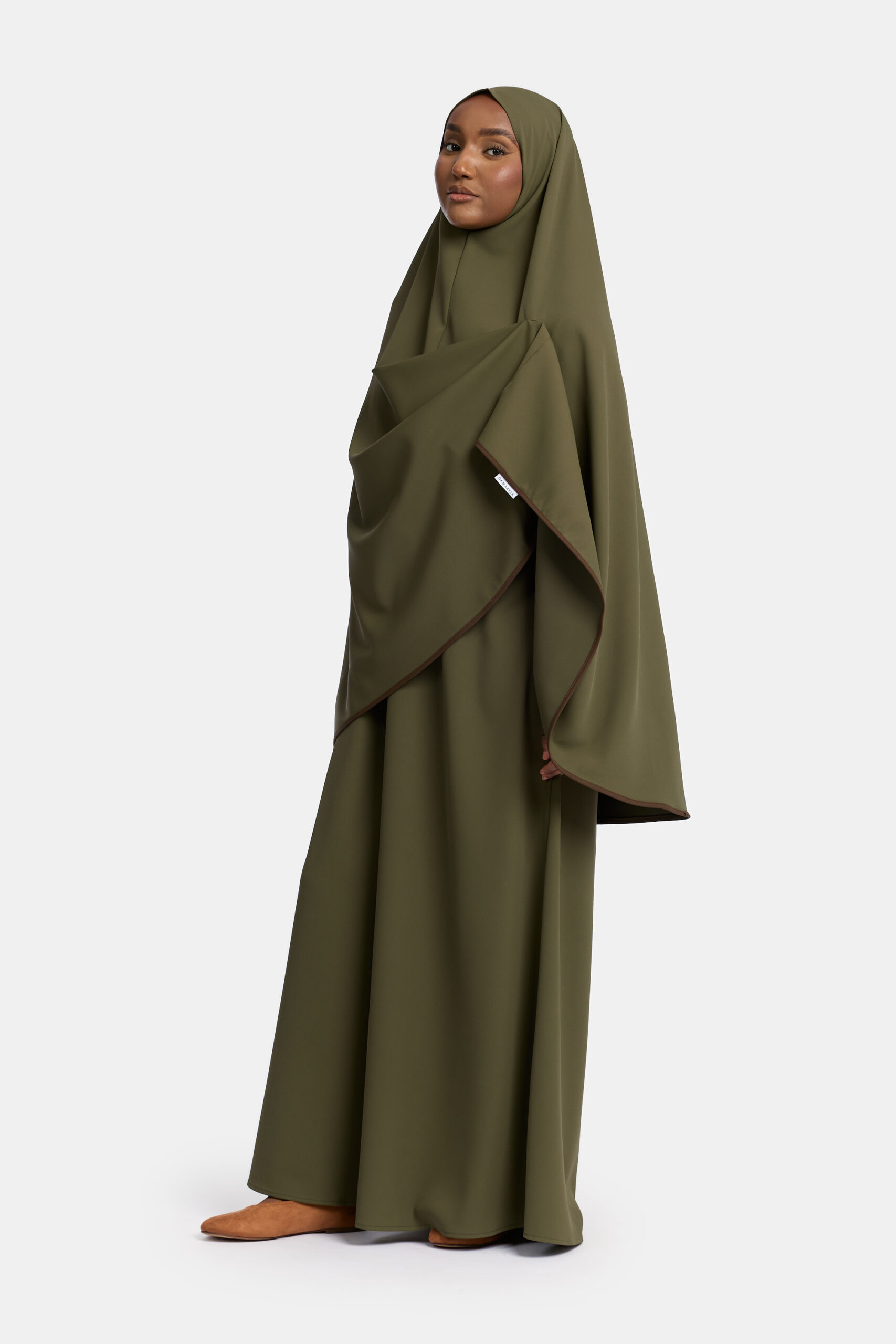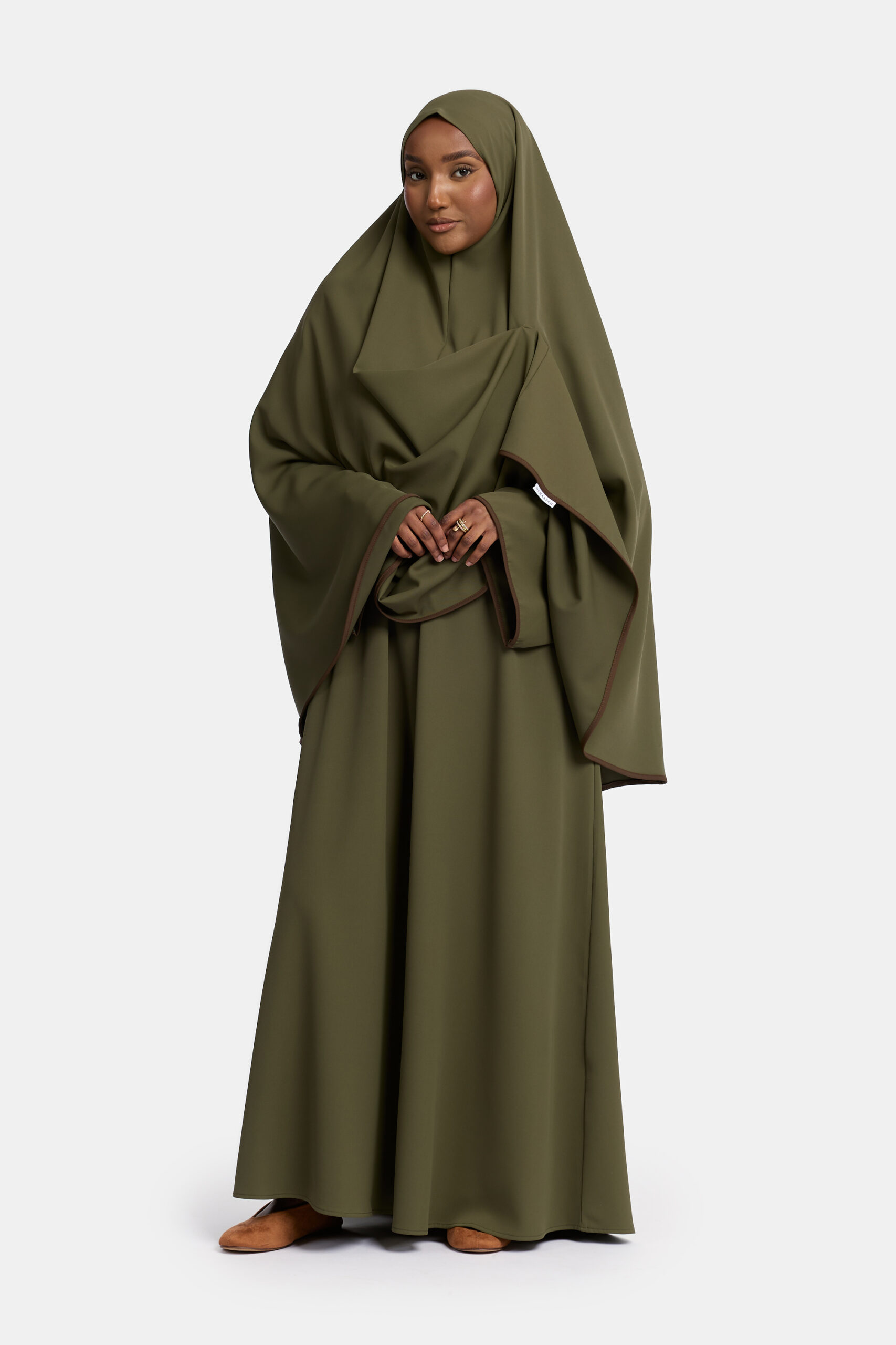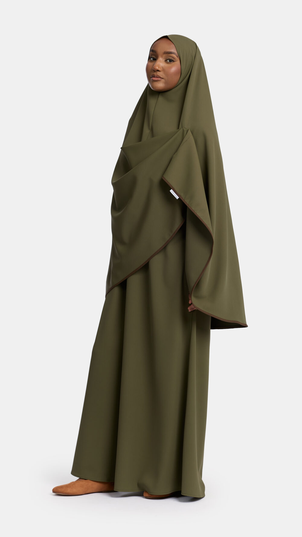 De bijbehorende khimar deelt dezelfde verfijnde kenmerken, waardoor het setje perfect te combineren is voor een complete look.