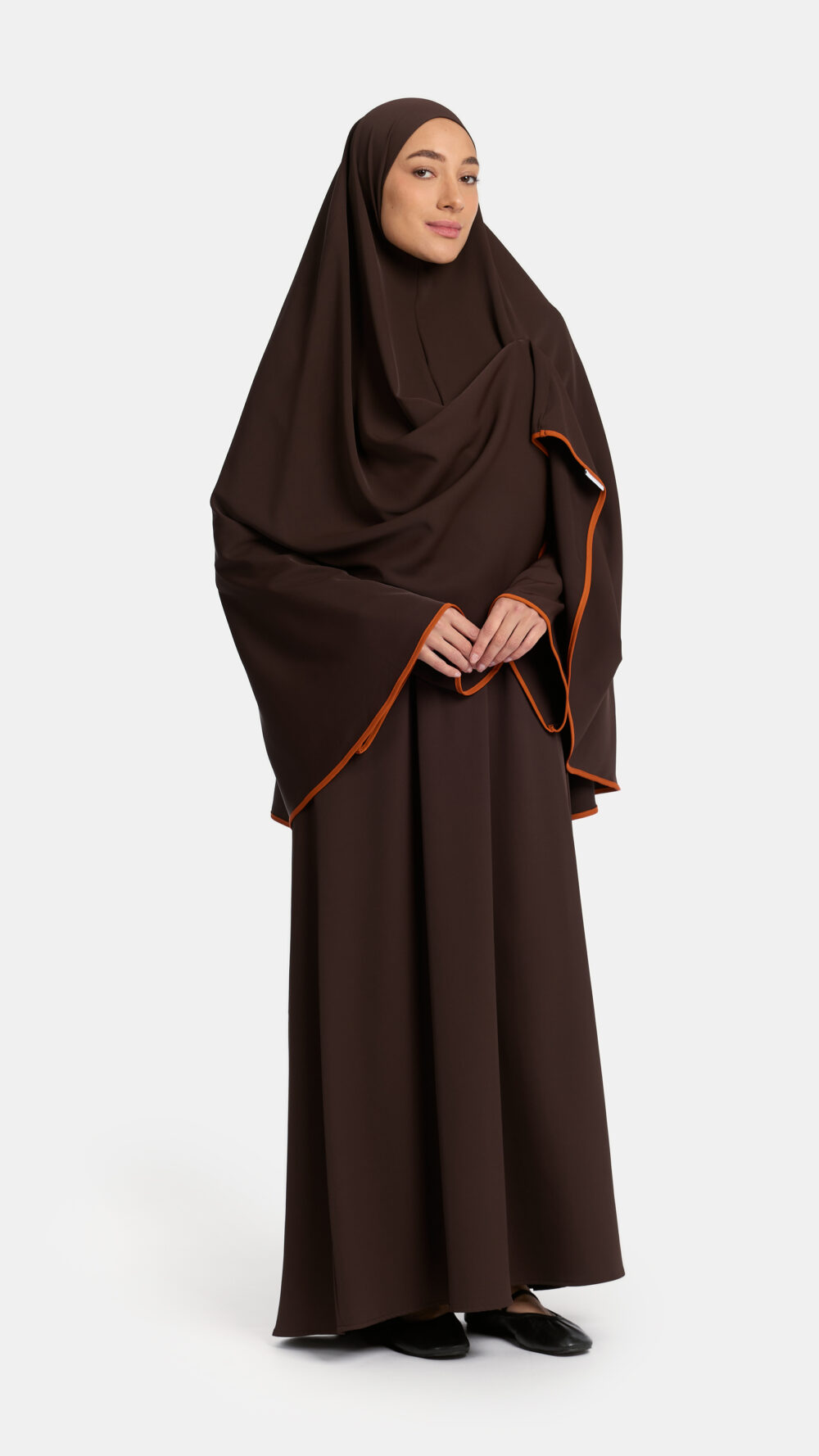 De bijbehorende khimar deelt dezelfde verfijnde kenmerken, waardoor het setje perfect te combineren is voor een complete look.