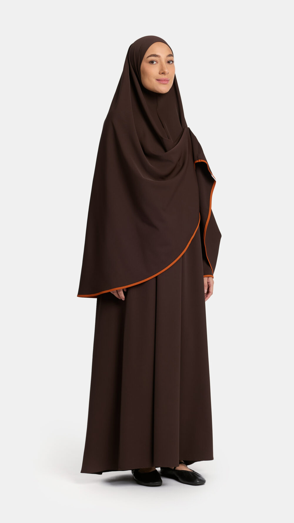 De bijbehorende khimar deelt dezelfde verfijnde kenmerken, waardoor het setje perfect te combineren is voor een complete look.