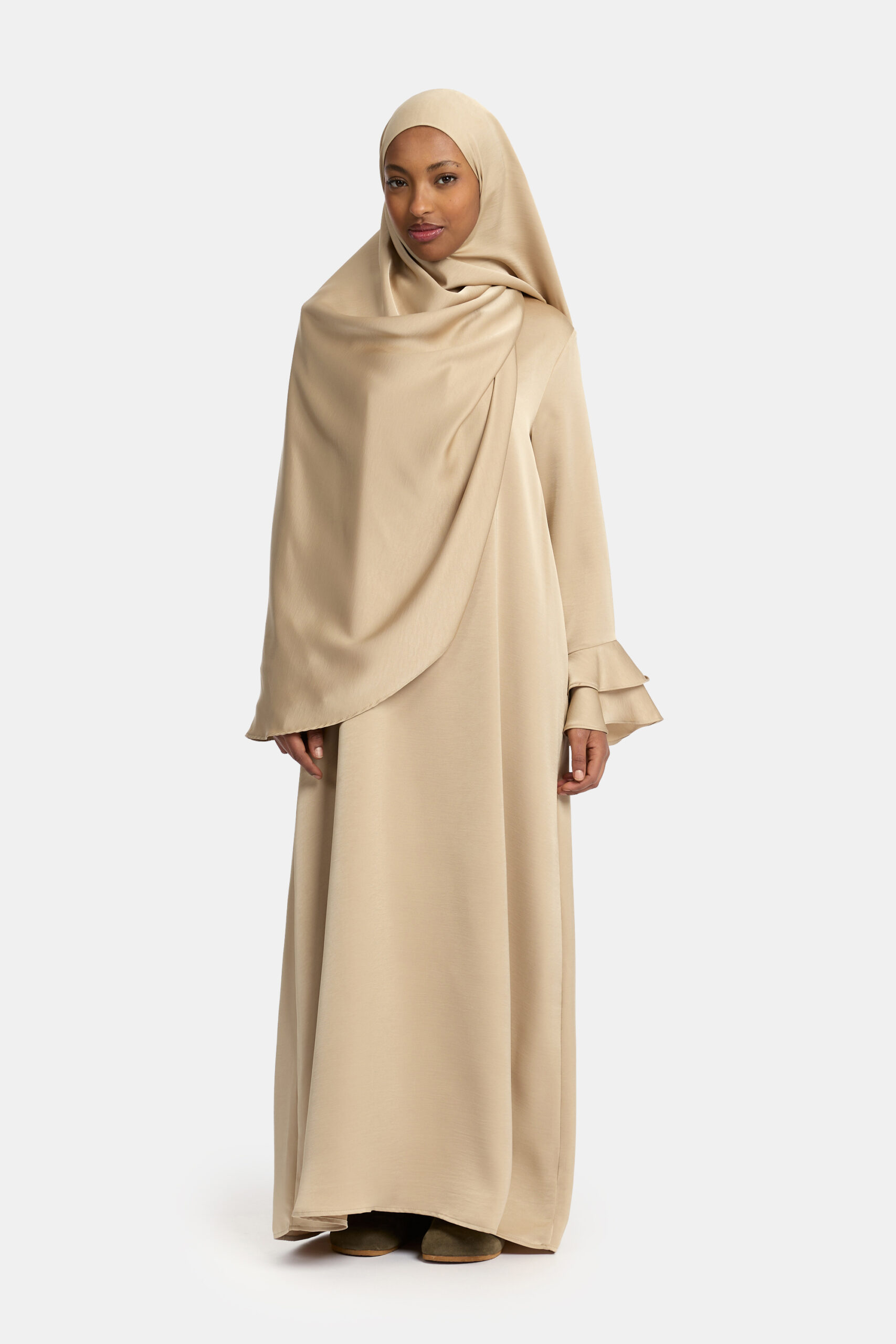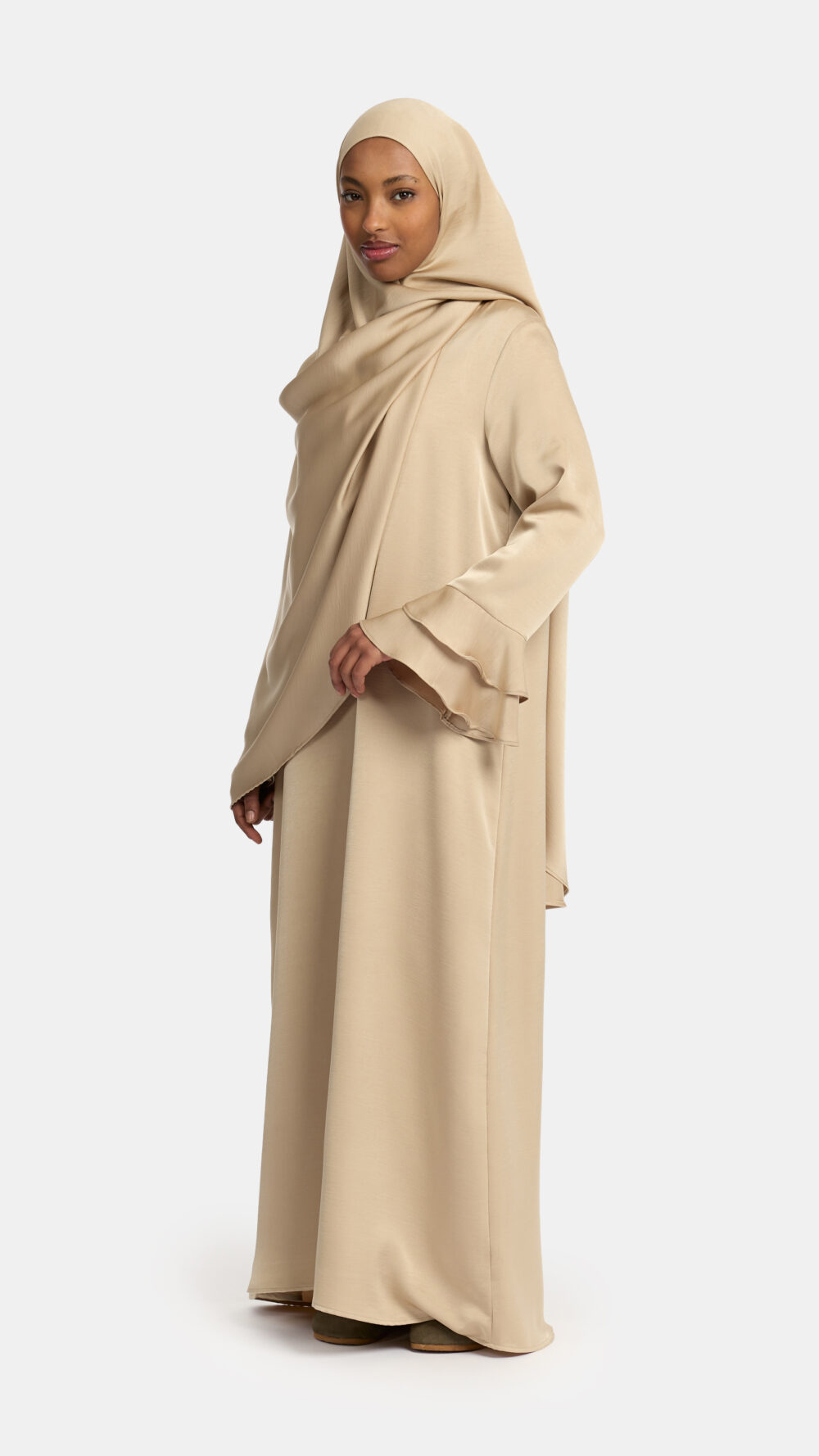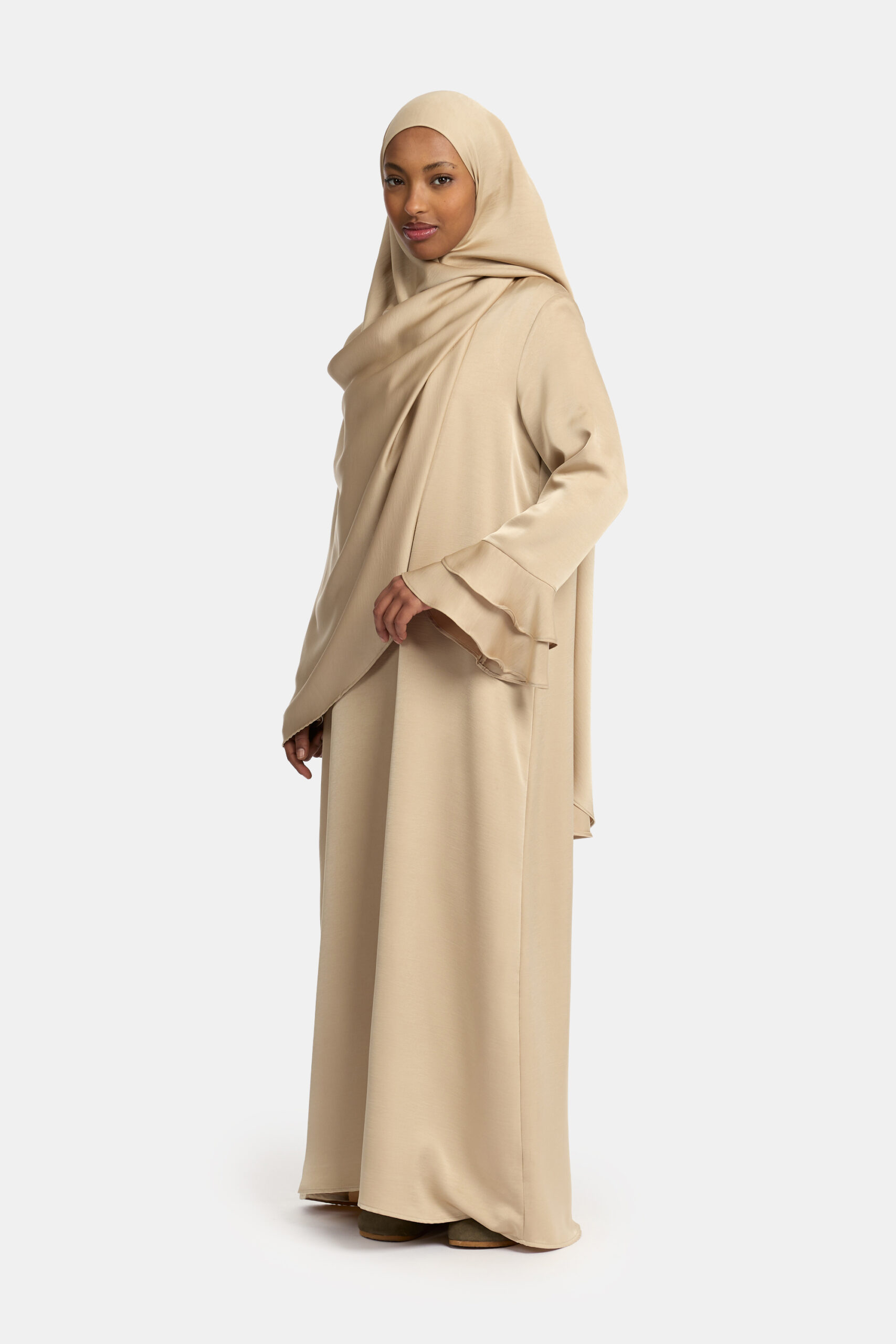 De Double Cute Sleeve Abaya is een elegante en tijdloze must have, Een comfortabele pasvorm met lichte stretch. De dubbele cute sleeve geeft de abaya een speelse, verfijnde en luxueuze uitstraling.