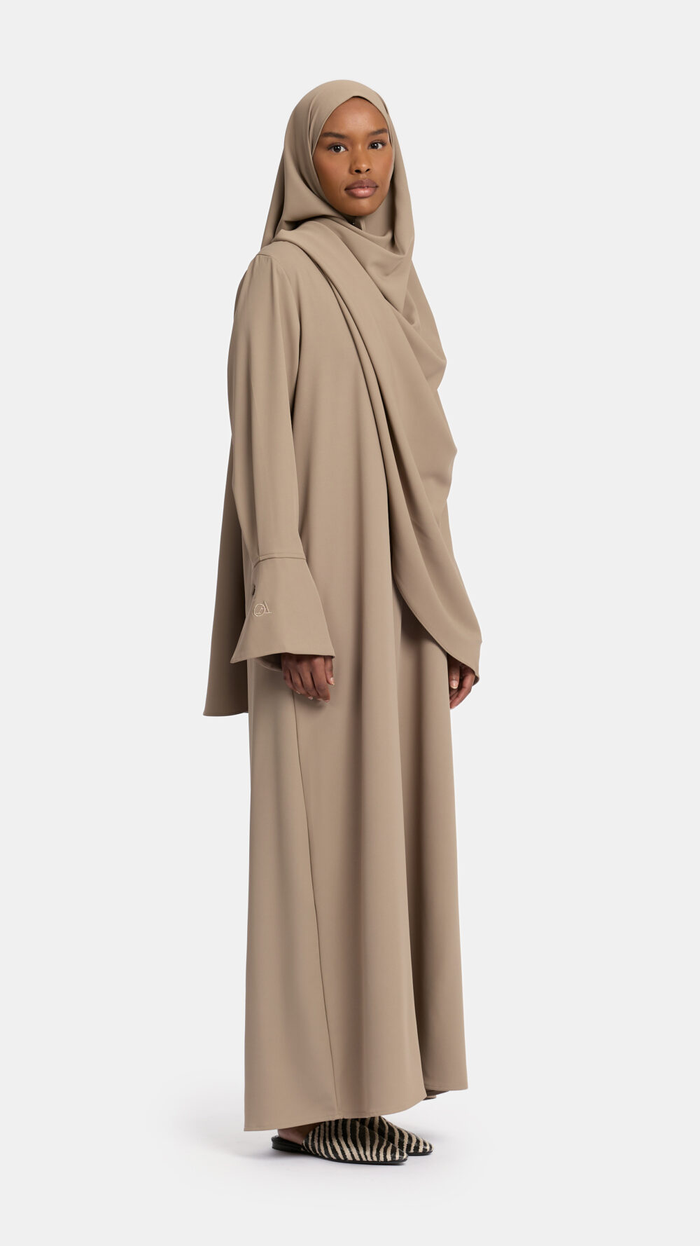 De Simplicity Abaya, gemaakt van 96% polyester en 4% spandex, is een verfijnd en tijdloos ontwerp, met unieke mouwen die de abaya een eigentijdse, luxe uitstraling geven. De subtiele V-hals en de unieke mouwen met hun verfijnde snit benadrukken de elegantie, terwijl het minimalistische ontwerp zorgt voor een moderne, bescheiden look die perfect is voor elke gelegenheid.