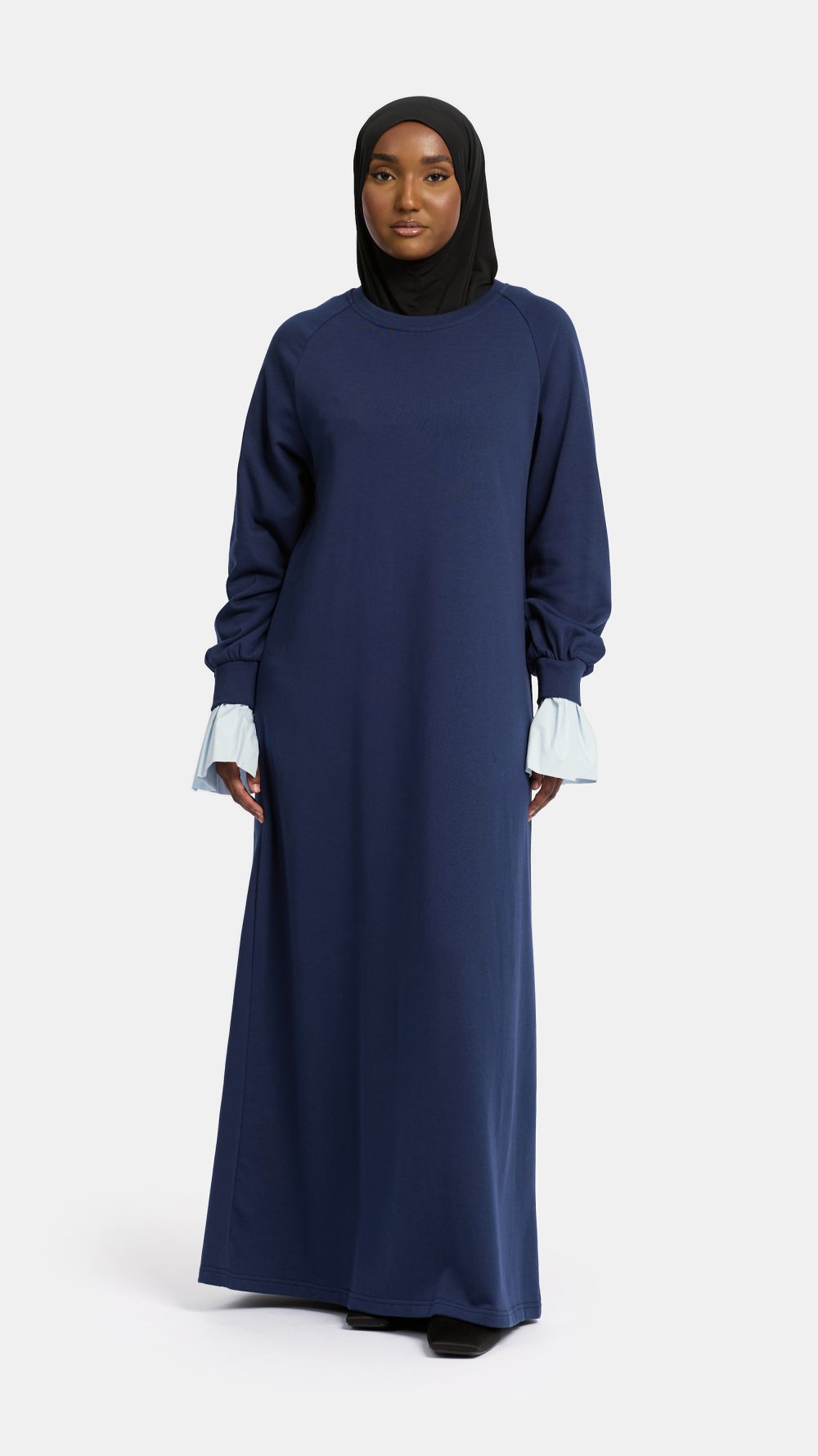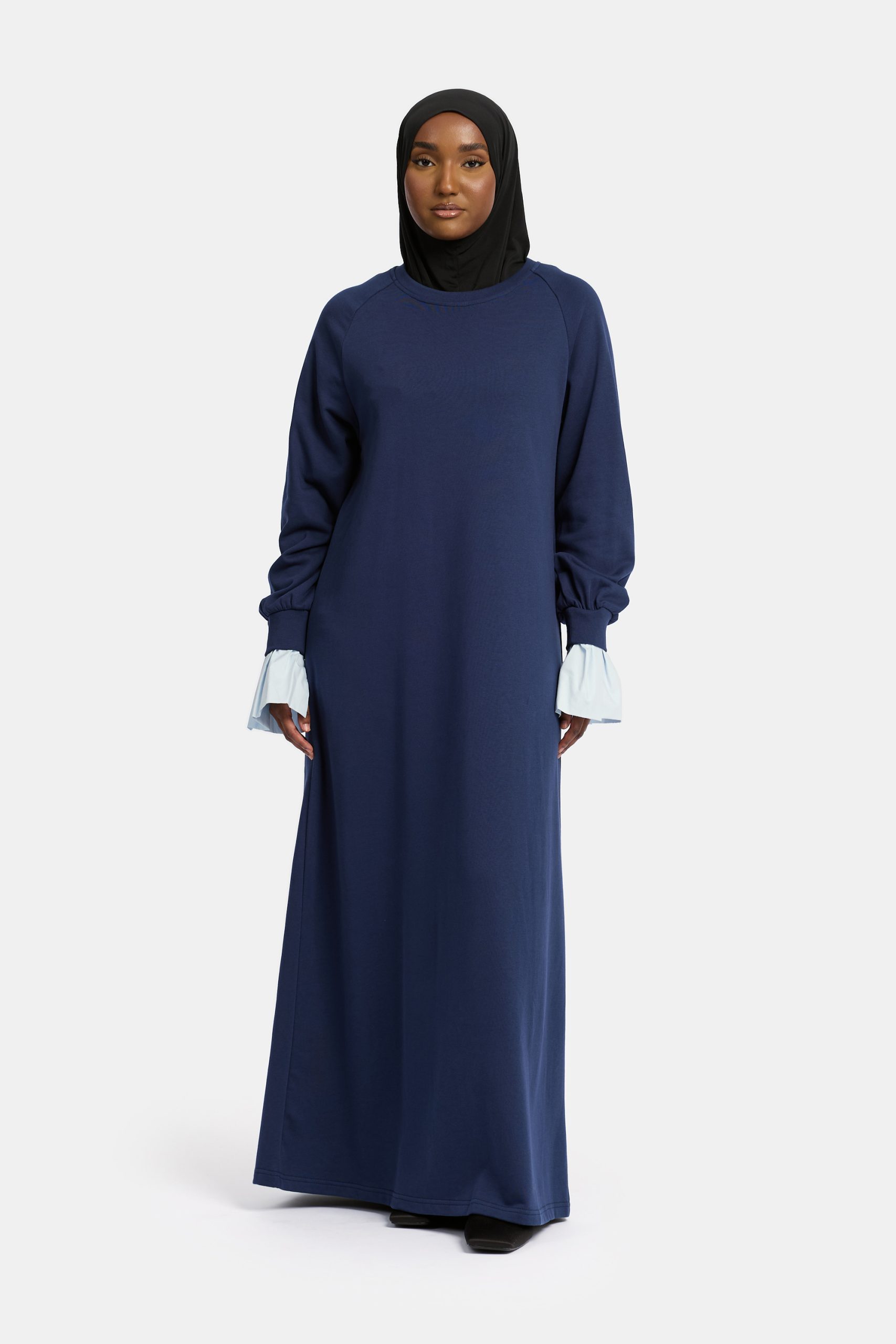 Deze abaya combineert het nonchalante comfort van een sweater met een verfijnd detail: blousemouwen die elegant uitsteken bij de pols.