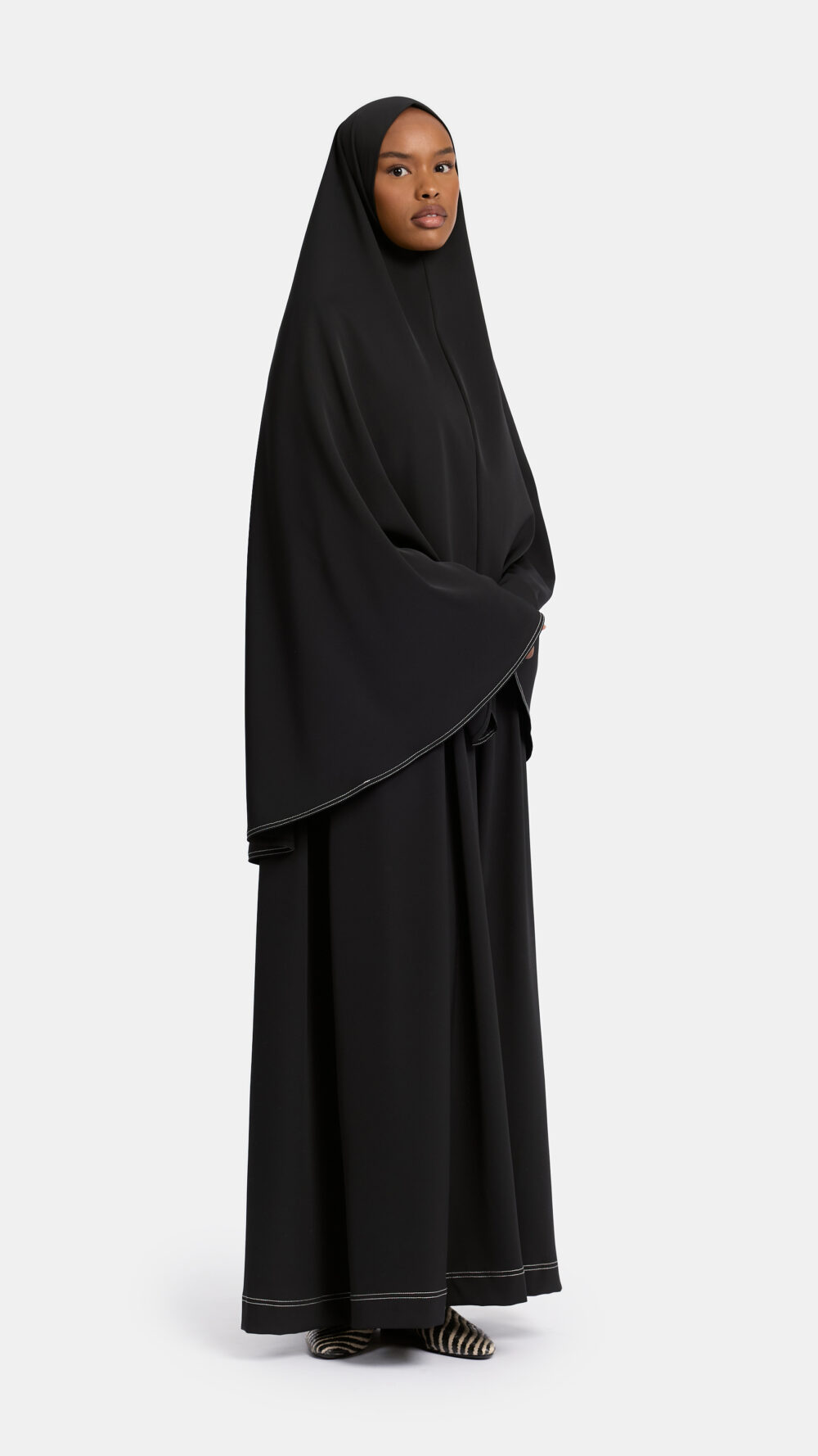 De Trim Khimar combineert moeiteloos comfort, functionaliteit en stijl. Gemaakt van een mediumweight stof (96% polyester, 4% spandex), biedt deze khimar precies de juiste dikte voor koelere dagen – zonder zwaar aan te voelen.