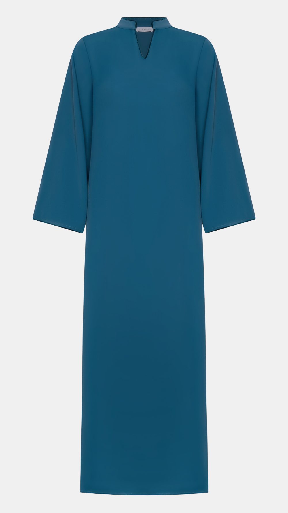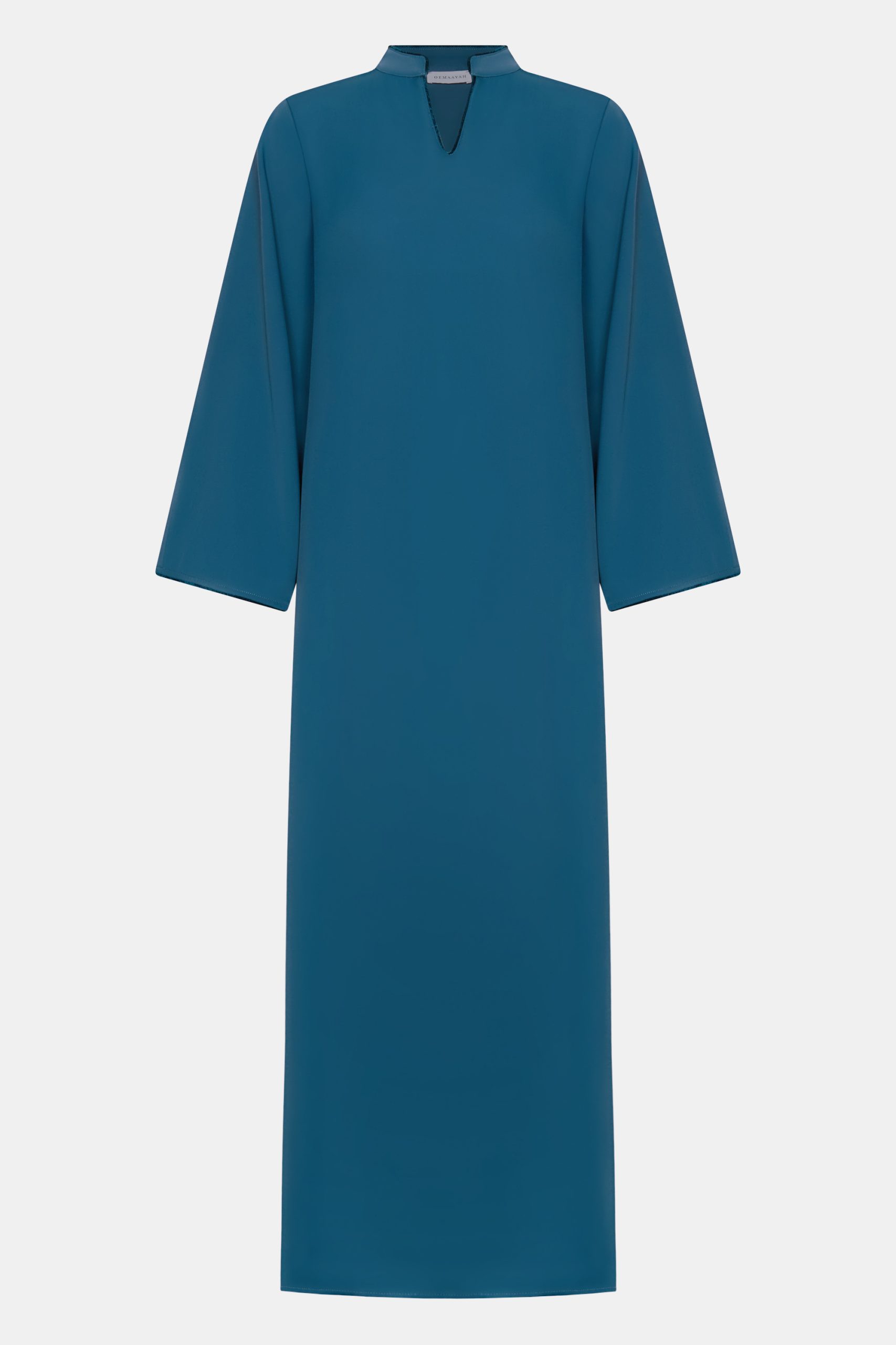 Deze prachtige abaya is ontworpen met een hoge kraag en wijdvallende mouwen, wat zorgt voor een koninklijke en tijdloze uitstraling.