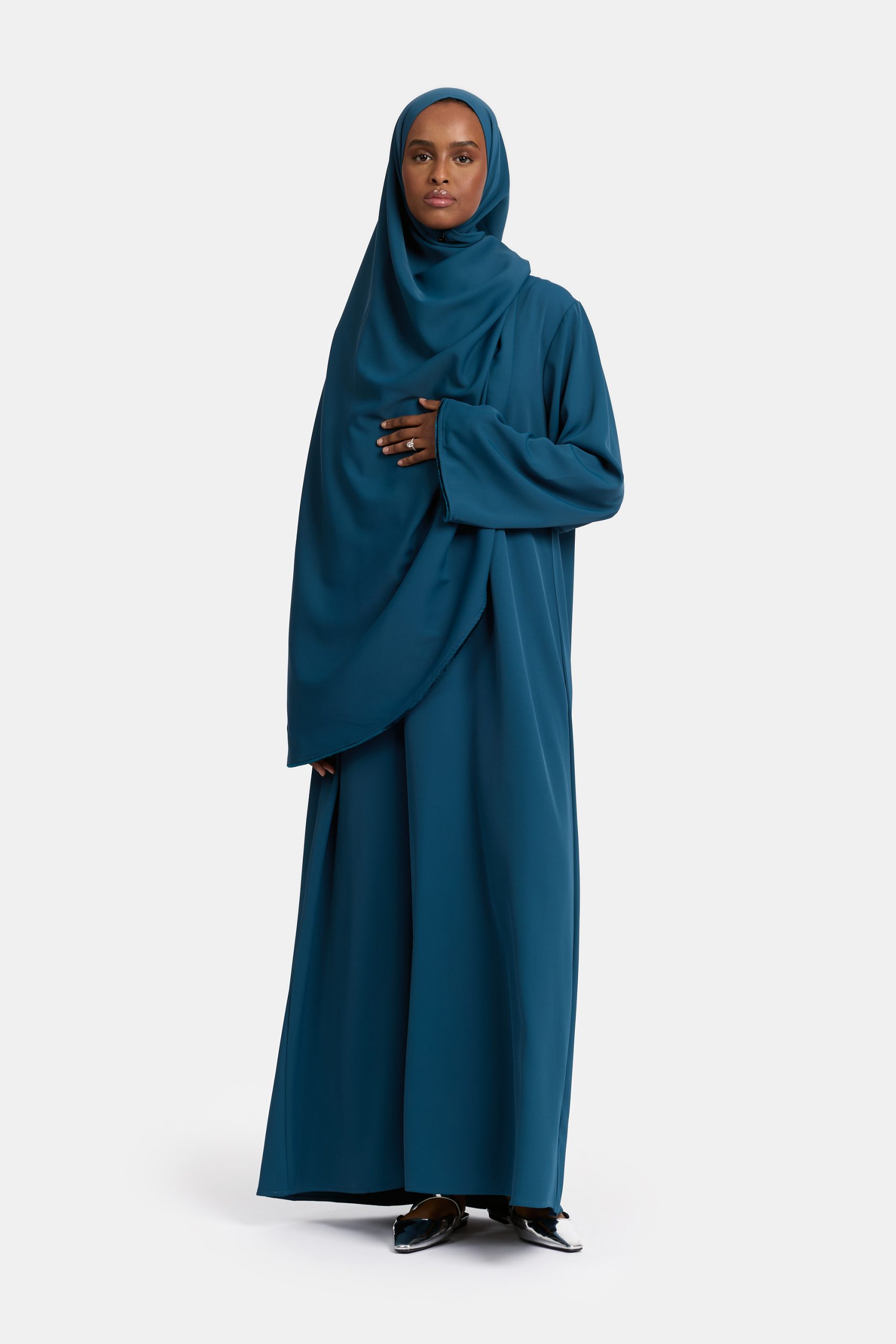 Wat deze abaya écht bijzonder maakt, is de subtiele maar luxe velvet afwerking aan zowel de kraag als de mouwen. De fluweelzachte touch voegt nét dat beetje extra toe perfect voor speciale gelegenheden of wanneer je een elegante en verfijnde look wilt creëren.