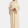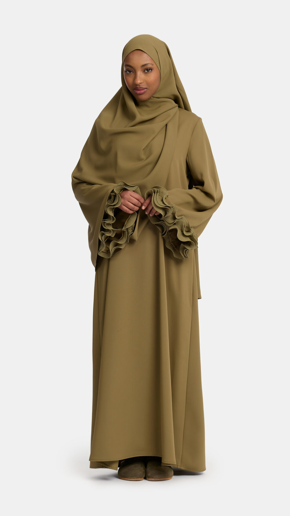 De gekrulde chiffon op de mouwen geeft de abaya een verfijnde en luxueuze uitstraling. In combinatie met de elegante V-hals en de wijde mouwen met gekruld chiffon-design ontstaat een stijlvolle en bescheiden look.