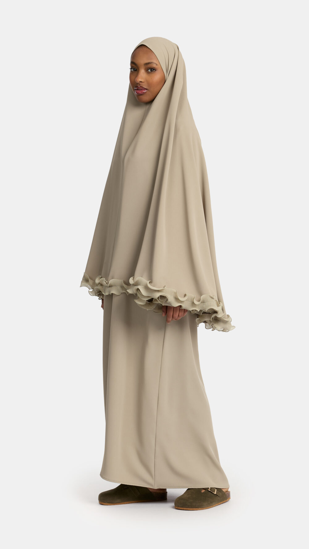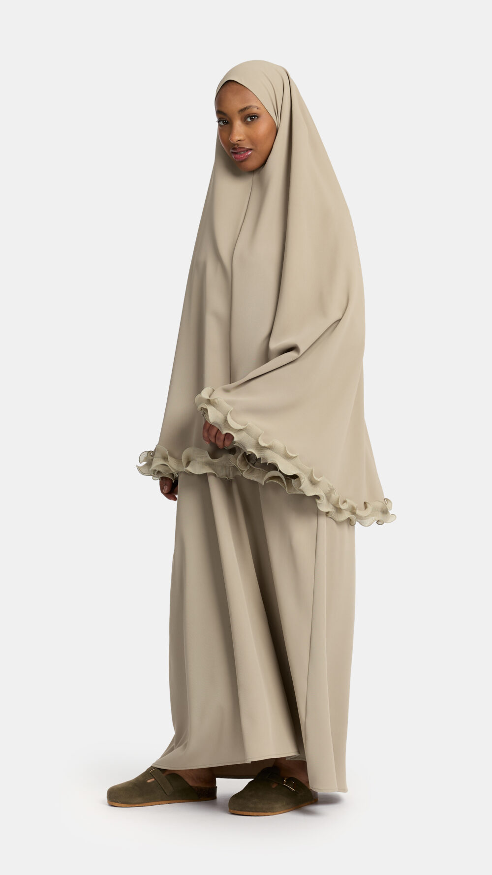 De Khimar combineert moeiteloos comfort, functionaliteit en stijl. Gemaakt van een mediumweight stof (95% polyester, 5% spandex), biedt deze khimar precies de juiste dikte voor koelere dagen zonder zwaar aan te voelen.